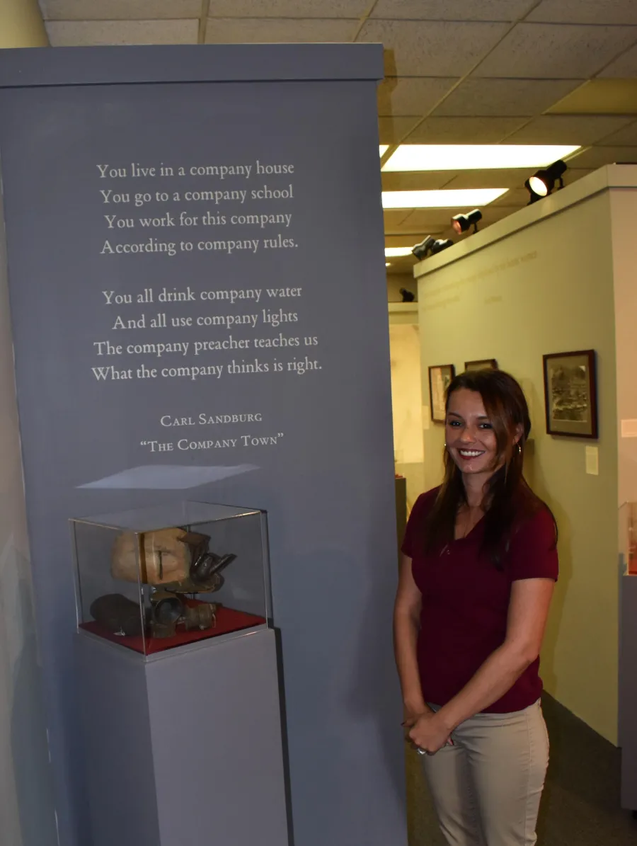 Chaplin's "'When the Leaves Come Out’ was typically attributed to ‘A Paint Creek Miner,’” says a small card beneath the poem.